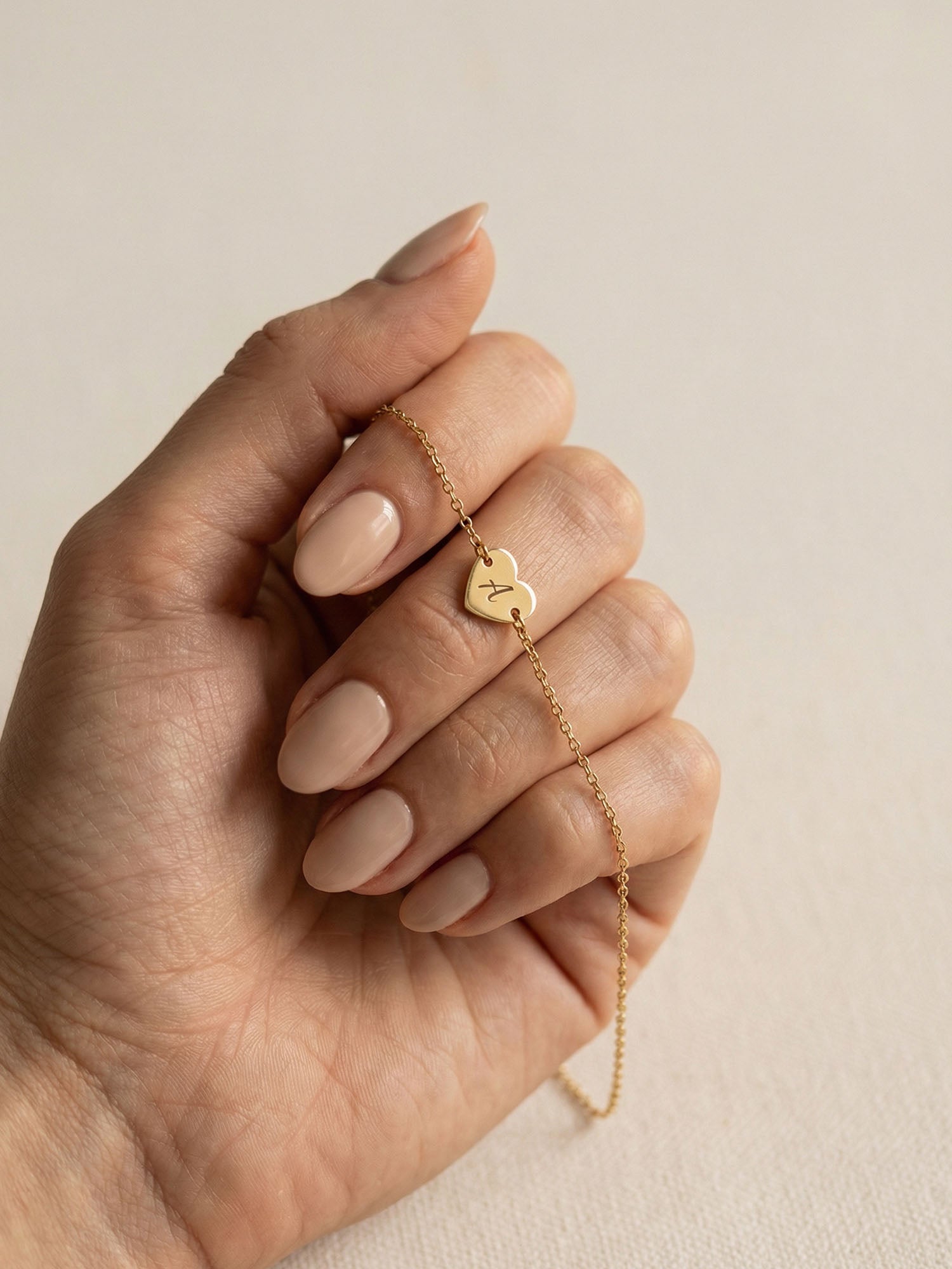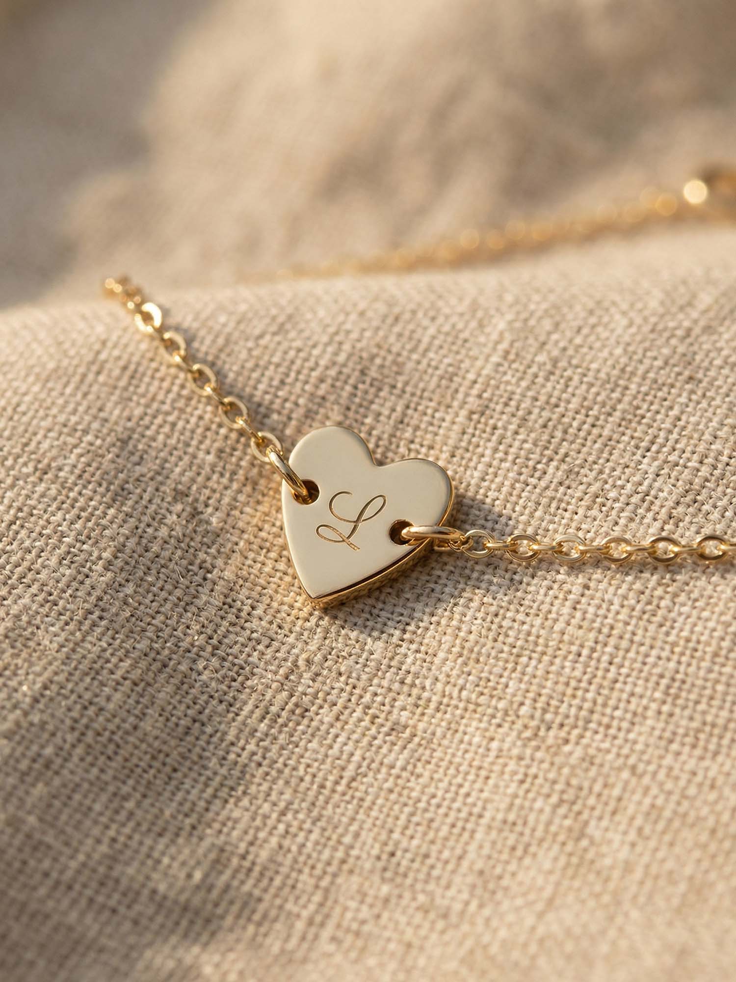 Amoria carries your initials – engraved on a delicate heart pendant, worn on a dainty bracelet.